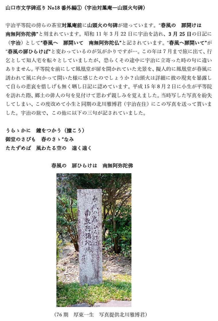 嘉村礒多 その3 犬鳴の滝―山頭火句碑 湯田温泉錦川通りー山頭火句碑 田温泉錦川通りー中原中也詩碑 新山口駅北口の山頭火歌碑 山頭火ー小郡其中庵 中原中也記念館 鳴滝公園の中也詩碑 中原中也詩碑「冬の長門峡」 番外_山頭火句碑(宇治対鳳庵そばの句碑) 番外編A(宇治黄檗山萬福寺―田上菊舎句碑)