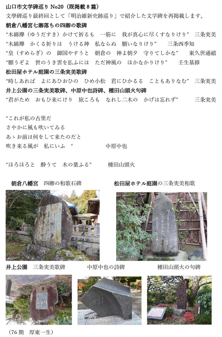 犬鳴の滝―山頭火句碑 湯田温泉錦川通りー山頭火句碑 田温泉錦川通りー中原中也詩碑 新山口駅北口の山頭火歌碑 山頭火ー小郡其中庵 中原中也記念館 鳴滝公園の中也詩碑 中原中也詩碑「冬の長門峡」 番外_山頭火句碑(宇治対鳳庵そばの句碑) 番外編A(宇治黄檗山萬福寺―田上菊舎句碑) 既掲載8編(最終回)